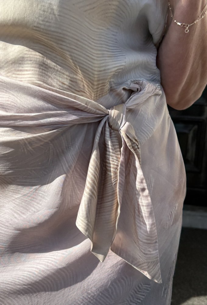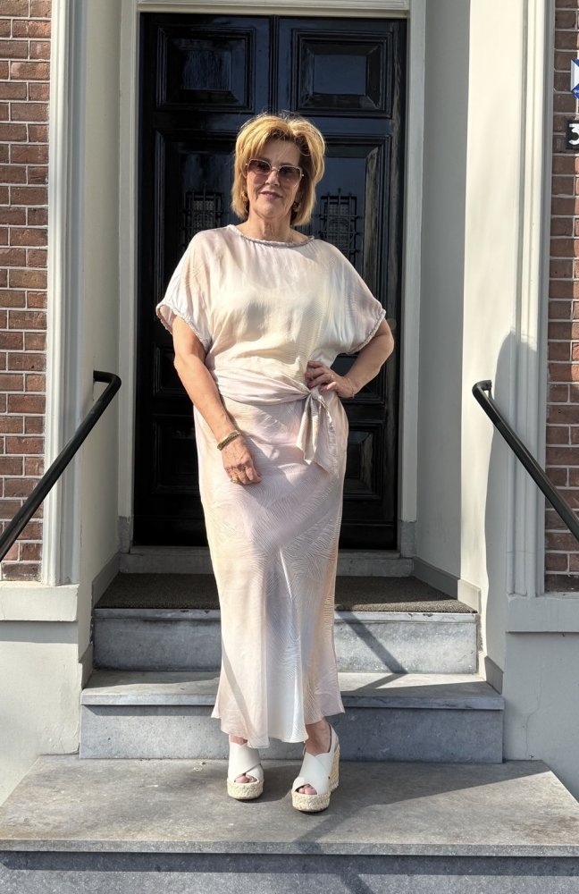 De losvallende top met korte mouw loopt moeiteloos over in de lange rok en wordt speels geaccentueerd met een strikdetail in de taille. Dit geeft net dat beetje vorm, zonder in te leveren op comfort. Je draagt hem losjes chic, maar hij voelt heerlijk luchtig en ontspannen aan.