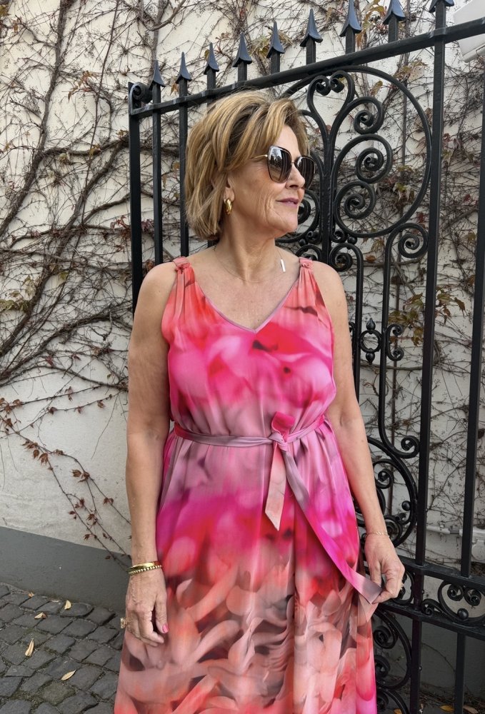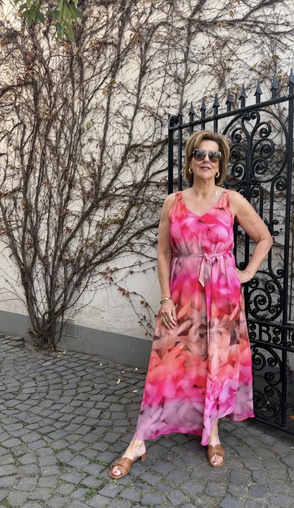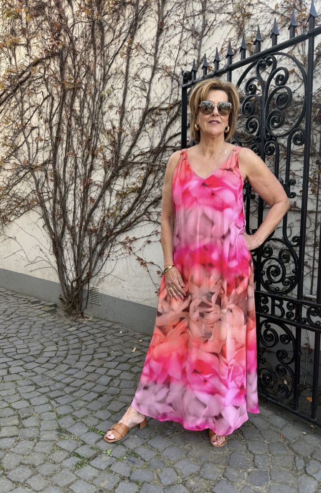 Deze lange jurk van Gustav is de perfecte combinatie van comfort en uitstraling. De soepele, luchtige stof valt prachtig langs het lichaam en beweegt elegant met je mee, terwijl de levendige print in roze- en koraaltinten direct een frisse, zomerse look geeft.