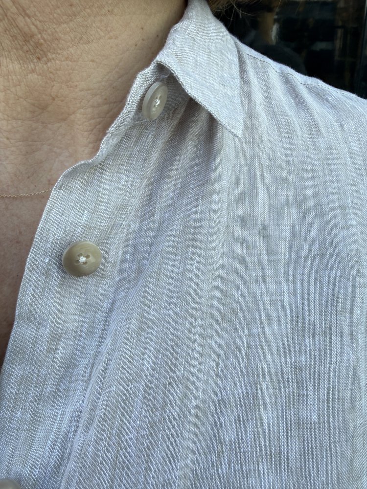 De rechte, losvallende pasvorm zorgt voor een ontspannen silhouet, terwijl de knoopsluiting en klassieke kraag het geheel een elegante touch geven. De subtiele structuur van het linnen geeft de jurk karakter en een luxe, nonchalante uitstraling.