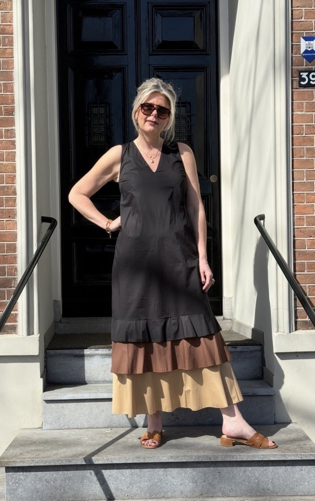 Deze mouwloze jurk van Icona is een echte allrounder die je zowel casual als gekleed kunt dragen. De strakke, minimalistische bovenkant zorgt voor een rustige en elegante uitstraling, terwijl de gelaagde onderzijde met subtiele volant juist een speels en vrouwelijk effect geeft.