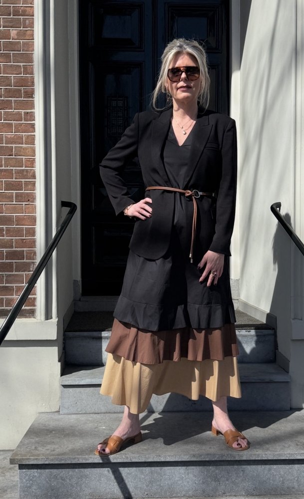 De combinatie van kleuren in de zoom maakt de jurk net even anders en geeft diepte aan je look, zonder dat het druk wordt. Precies die balans waar je naar op zoek bent.