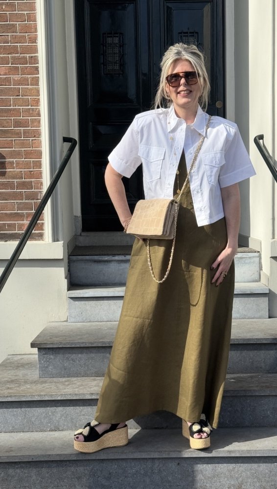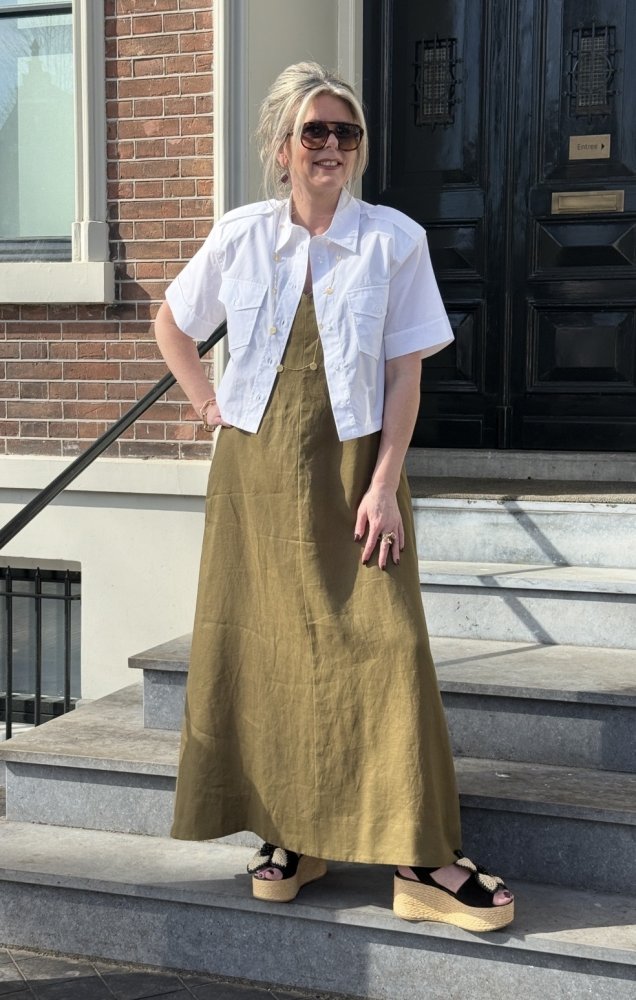Deze mouwloze linnen jurk van Icona in olijfgroen straalt rust, klasse en verfijning uit. Een kleur die prachtig staat bij veel huidtinten en moeiteloos combineert met zowel neutrale als warme accessoires.