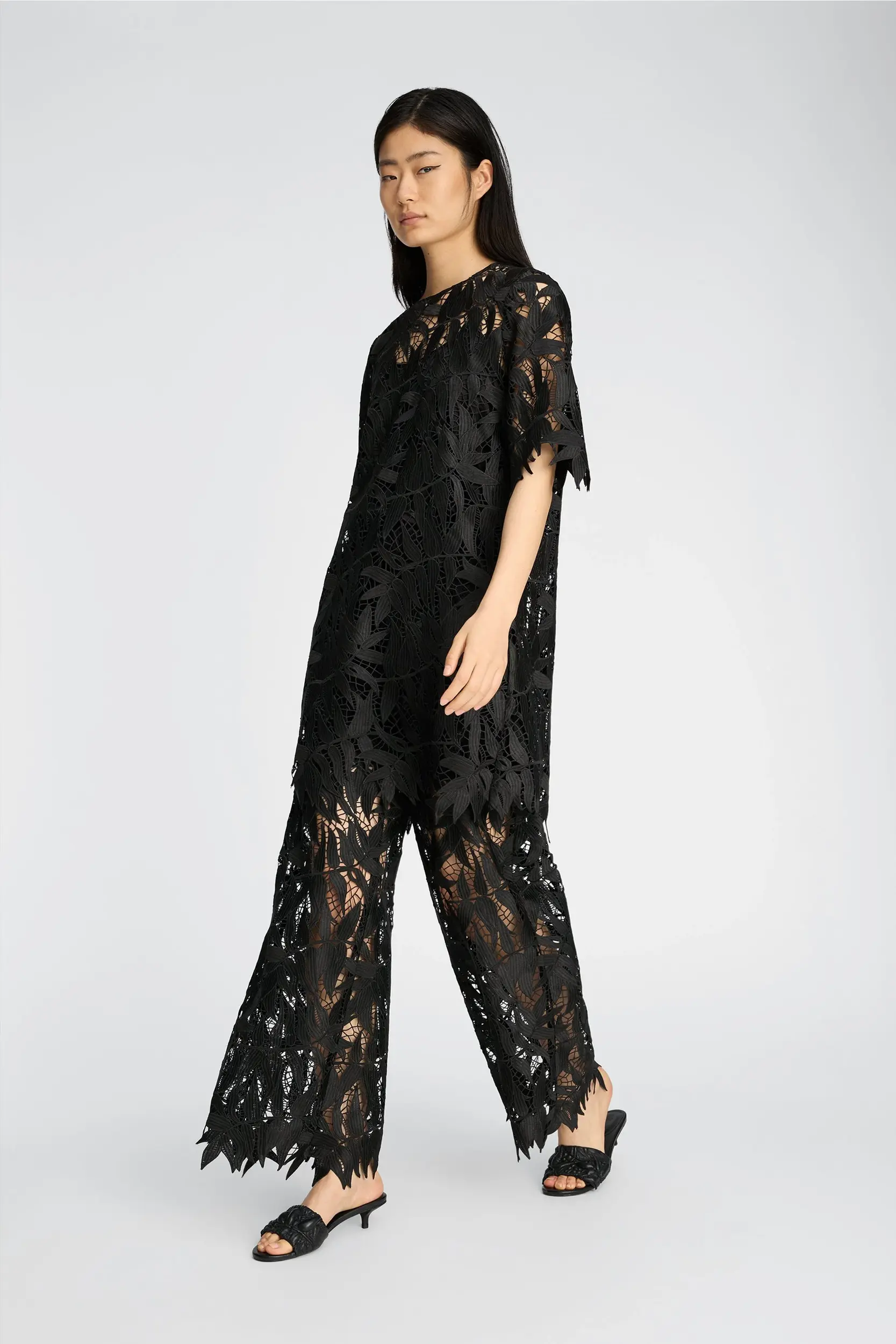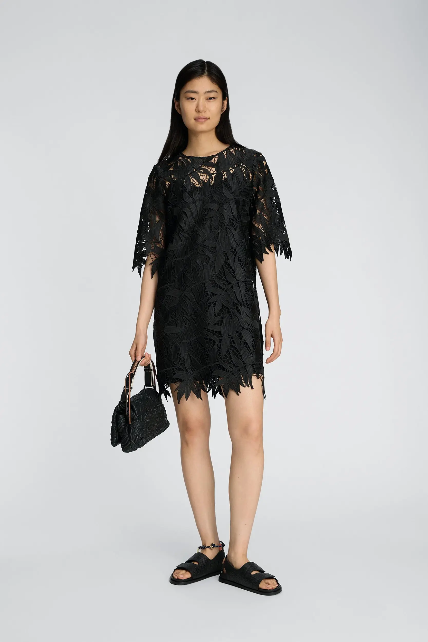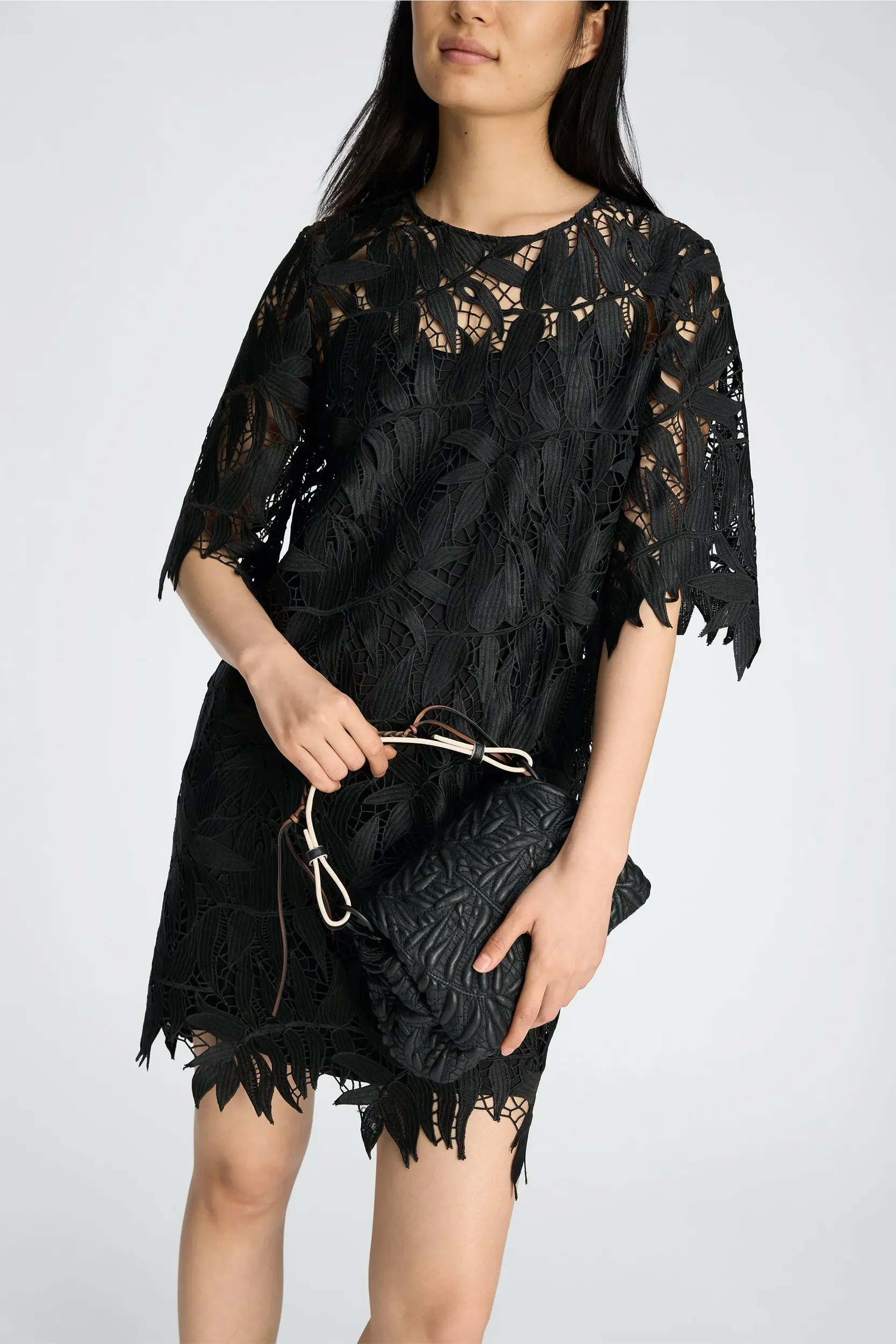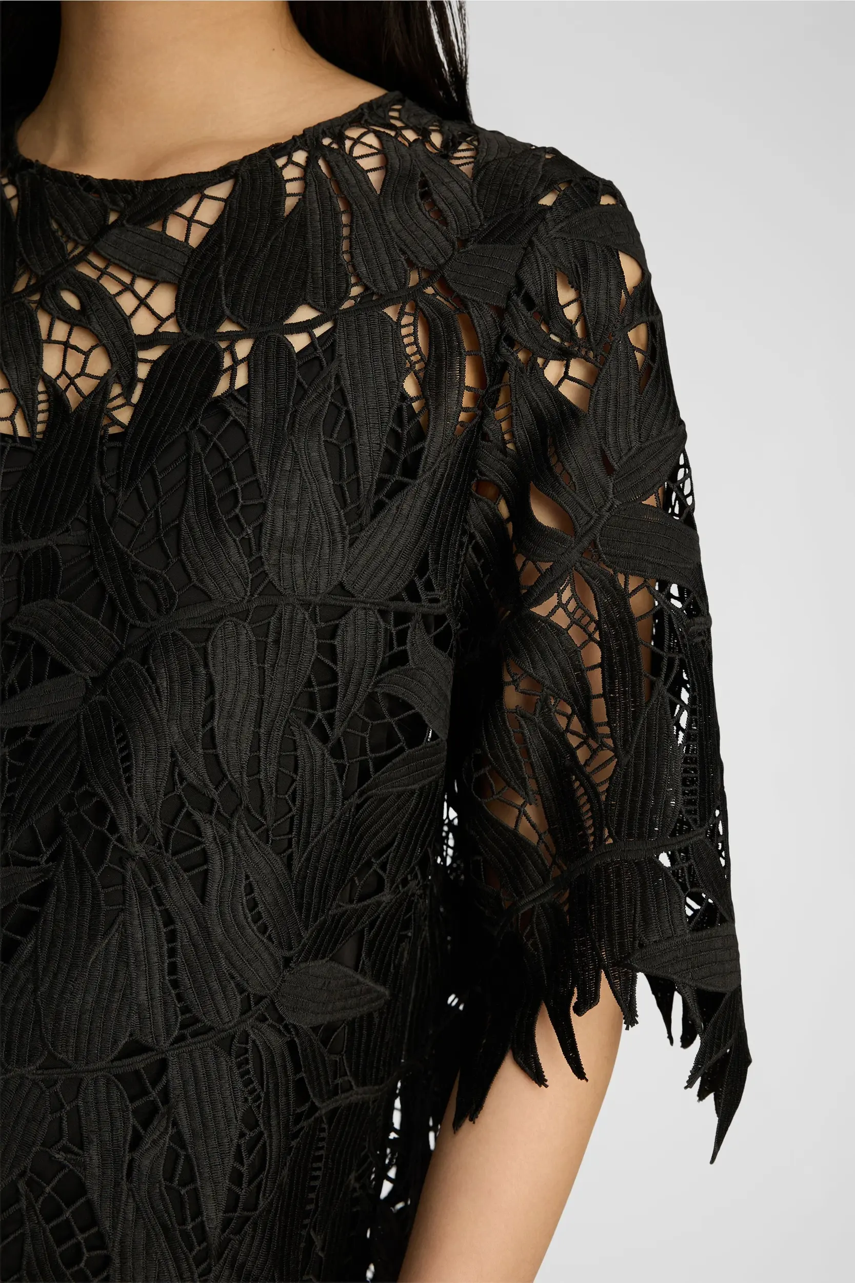 Jurk gemaakt van een gestructureerde kantstof met een bladvormig patroon en een licht open, gestructureerd oppervlak. Het ontwerp heeft korte mouwen, een ronde hals en een rechte pasvorm. De gevormde, onafgewerkte randen benadrukken het patroon van de stof en zorgen voor een subtiele, gestructureerde afwerking.