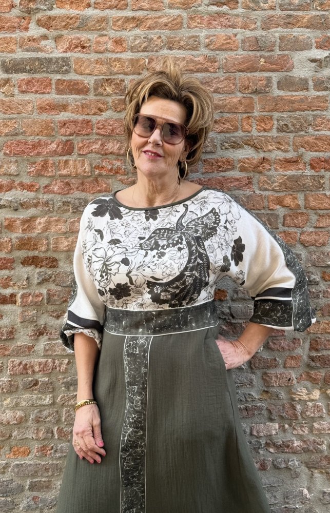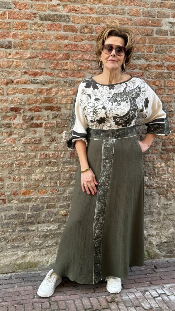 Wita Long Dress van Gustav is de perfecte jurk voor zowel feestelijke gelegenheden als zomerse events. Deze elegante lange jurk in off-white met een prachtig olijfgroen dessin combineert tijdloze klasse met een moderne uitstraling.