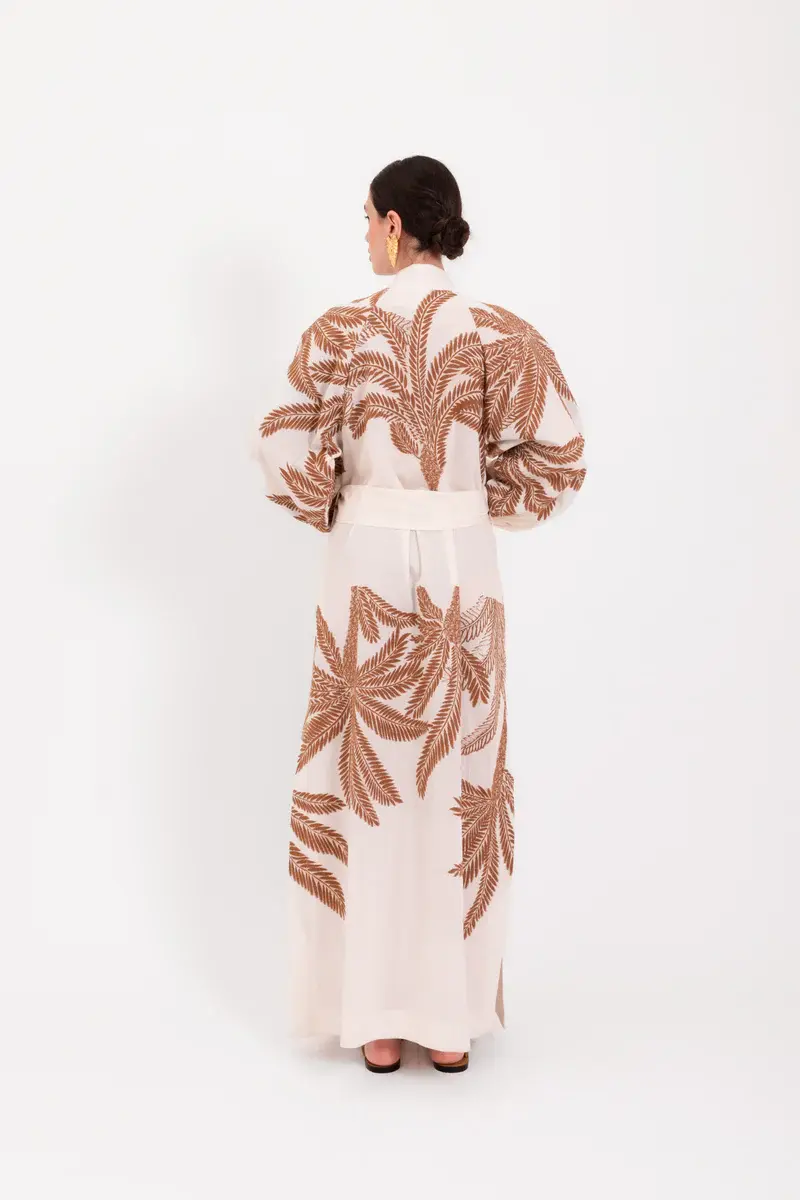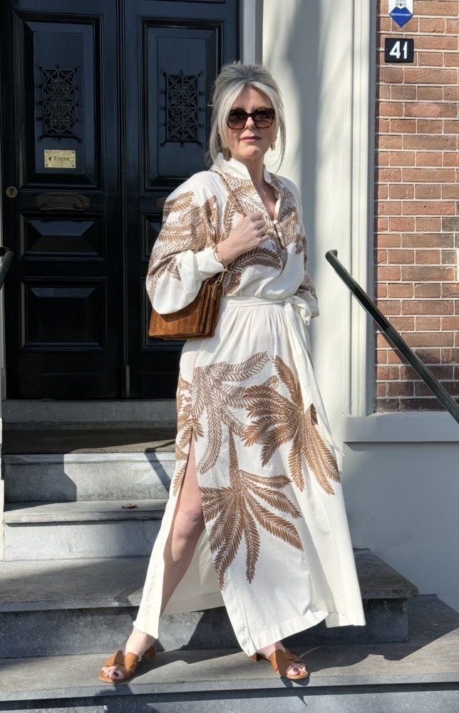 De zachte lichtbeige kleur vormt de perfecte basis voor het verfijnde palmreliëf in warme bruintinten. De mandarijnkraag en subtiele opening aan de voorzijde geven een vrouwelijke, verfijnde uitstraling. Met de brede tailleband creëer je een mooi silhouet, terwijl de lange, wijde mouwen met hoge manchetten zorgen voor een stijlvolle en krachtige finish.