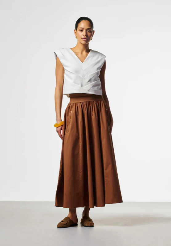 De hoge tailleband zorgt voor een flatterende pasvorm en draagt comfortabel gedurende de hele dag. De soepele plooien geven de rok een vloeiend silhouet dat mooi met je meebeweegt bij elke stap. Dankzij de verborgen zakken aan de zijkant is deze rok niet alleen stijlvol, maar ook praktisch.