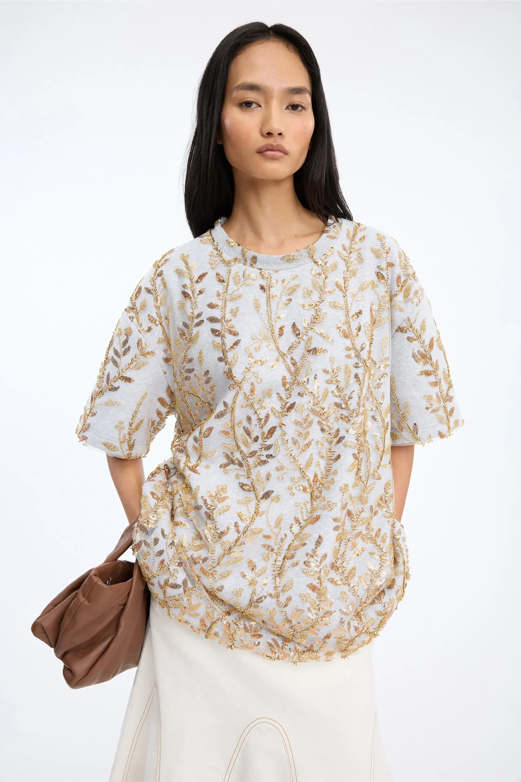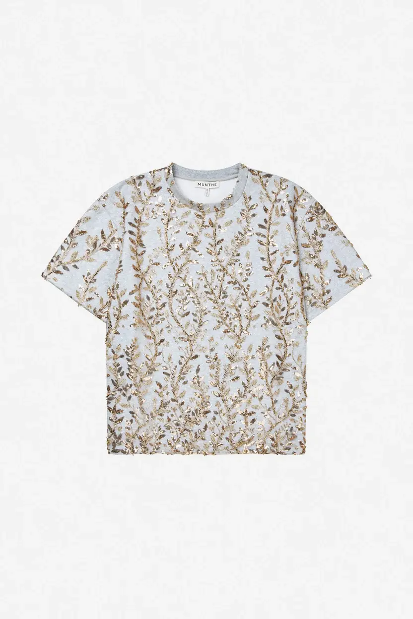 T-shirt met een oversized pasvorm versierd met een dicht patroon van goudgetinte pailletten en parels in een bladpatroon. Hij heeft korte mouwen, een ronde halslijn en een licht, flexibel materiaal.