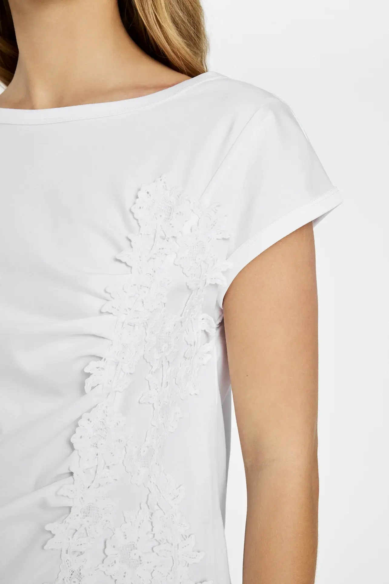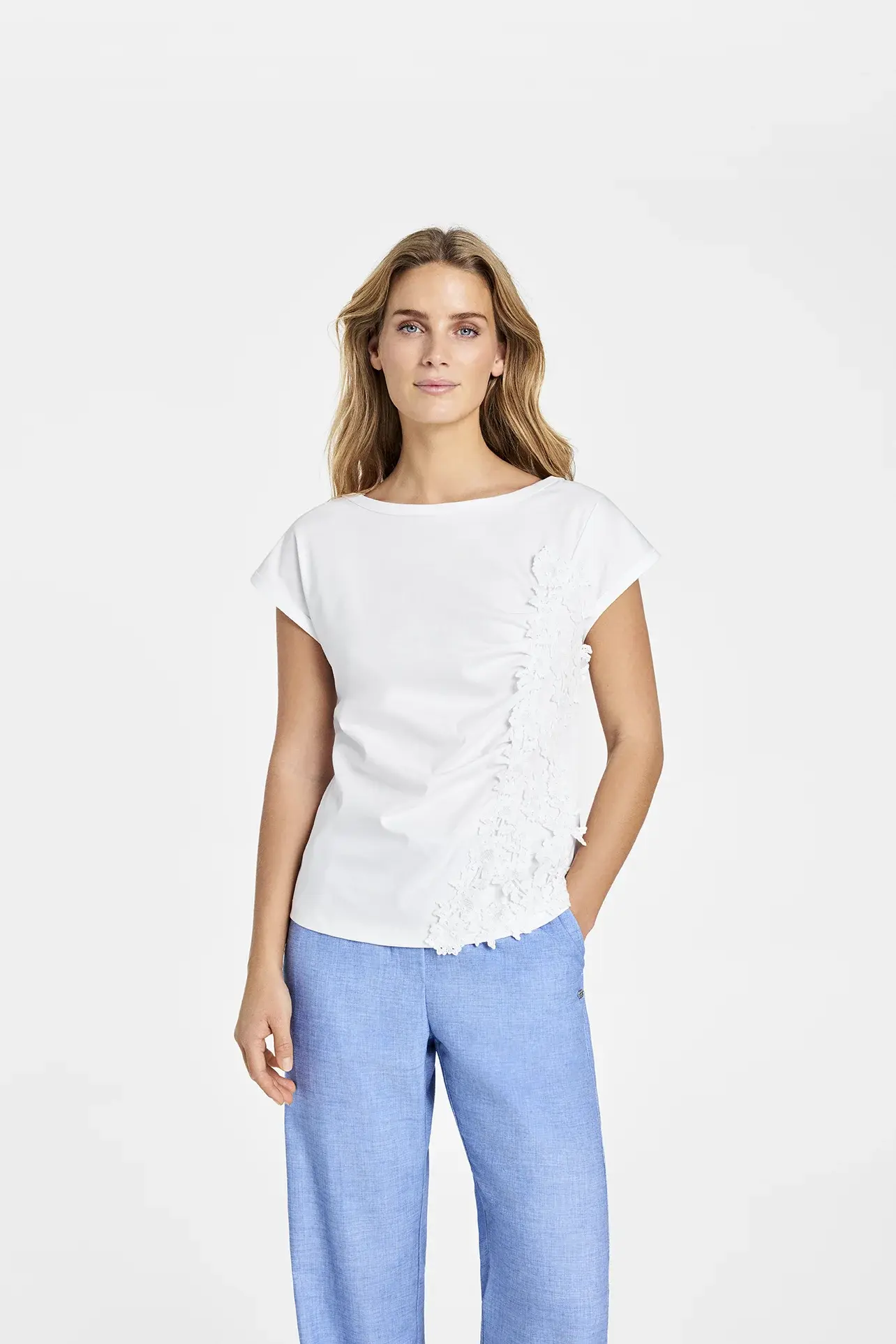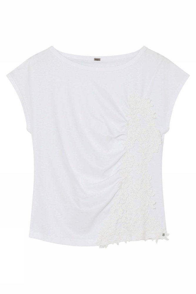 De subtiele applicatie aan de zijkant geeft het shirt een vrouwelijke en speelse touch, zonder dat het zijn rustige en elegante karakter verliest.