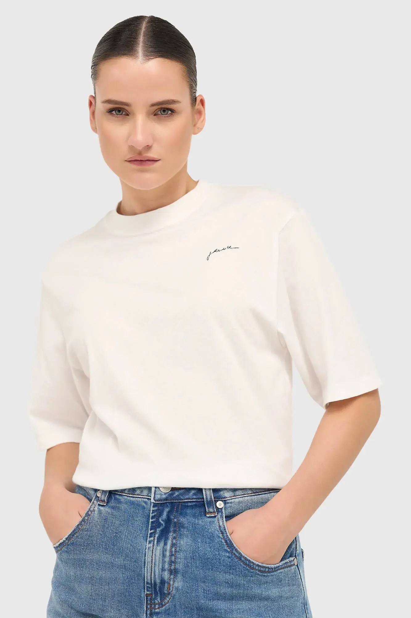De wit dames shirt katoen ADAM TEKST van JANICE is een zachte, comfortabele basic die perfect aansluit bij de stijl en kwaliteit waar het merk om bekendstaat. Dit shirt is gemaakt van 100% katoen en voelt luchtig aan op de huid. Dankzij de ronde hals en de korte mouwen krijgt het ontwerp een tijdloze uitstraling, terwijl de ontspannen pasvorm ervoor zorgt dat het shirt comfortabel langs het lichaam valt zonder strak te zitten. Een ideale basis voor vrouwen die houden van luxe dames tops met een ingetogen, stijlvolle uitstraling.