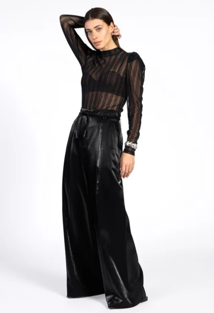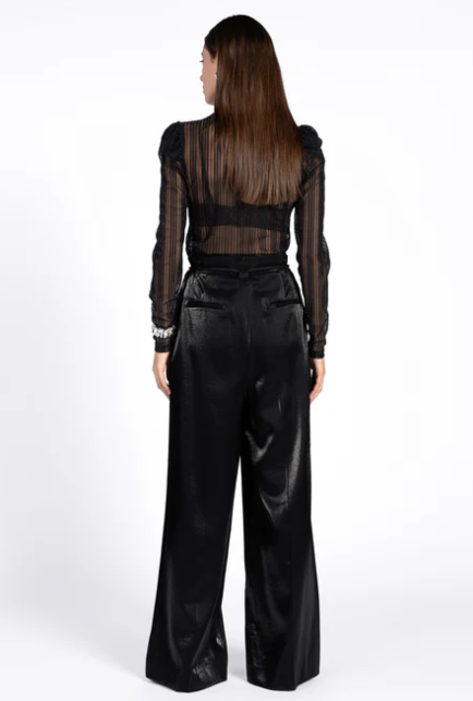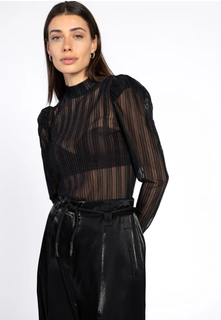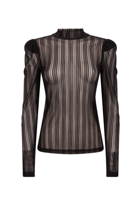 De Ivona Mesh Top is uitgevoerd in een zachte, transparante meshstof met verticale glitterstrepen. Dit geeft de top een speels en feestelijk effect. De top heeft een aansluitend silhouet, hoge hals en subtiele pofmouwen. Perfect om te dragen over een bralette of onder een blazer voor een chique, gelaagde look.