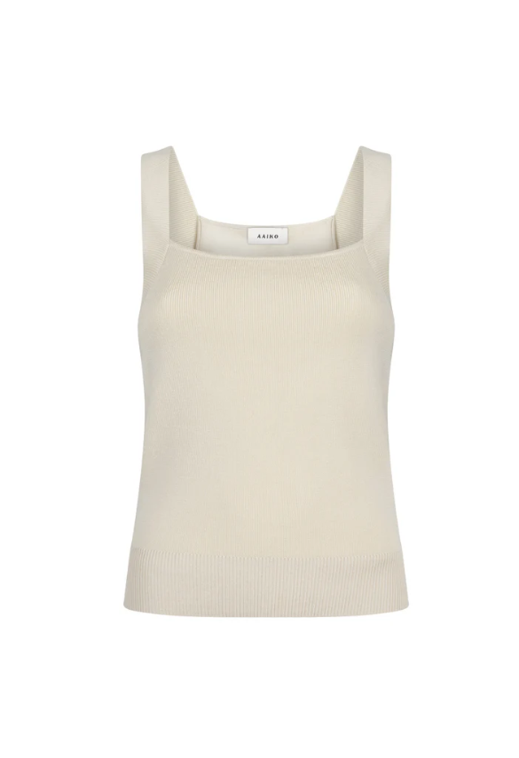 Deze top in een zachte crèmekleur is een tijdloos basisstuk met een elegante uitstraling. Het model heeft brede schouderbanden en een rechte halslijn voor een moderne look. De aansluitende pasvorm benadrukt het silhouet en de fijngebreide stof voelt comfortabel aan op de huid. Perfect om solo te dragen of onder een jasje.