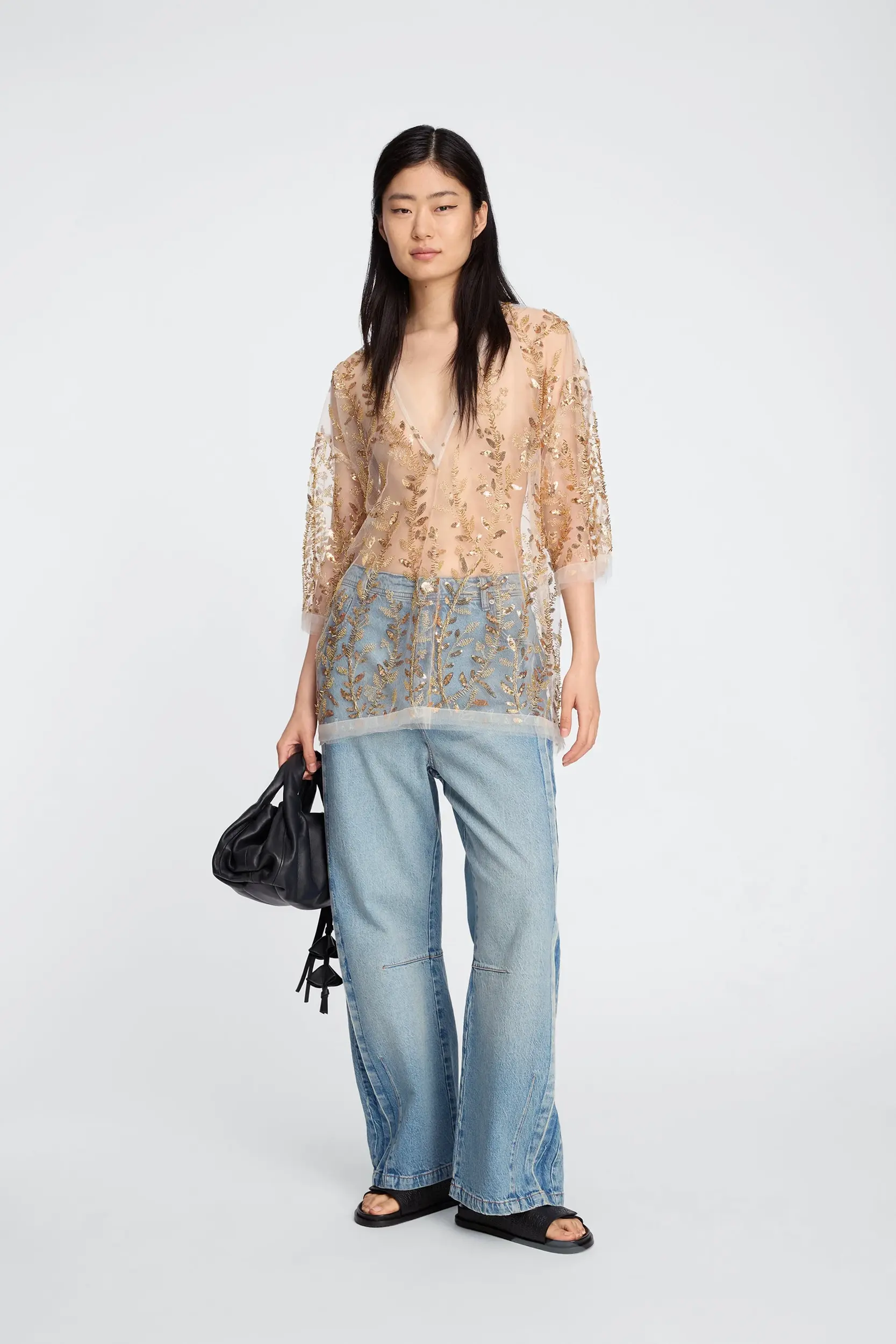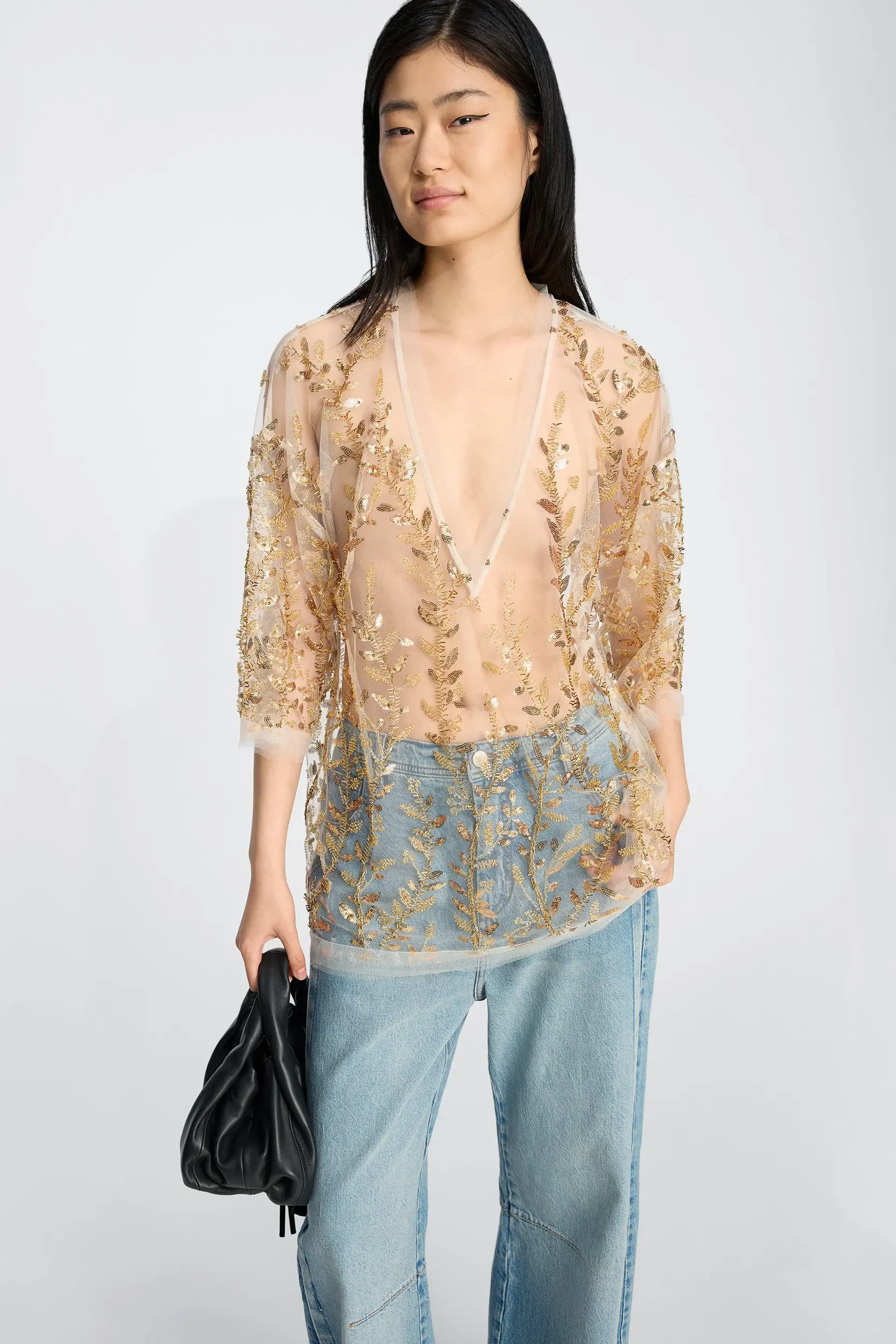 Deze top is gemaakt van een lichte, doorschijnende stof met dicht op elkaar geplaatste goudkleurige pailletten en parels. Hij heeft een rechte pasvorm, korte mouwen en een hoge, ronde hals.