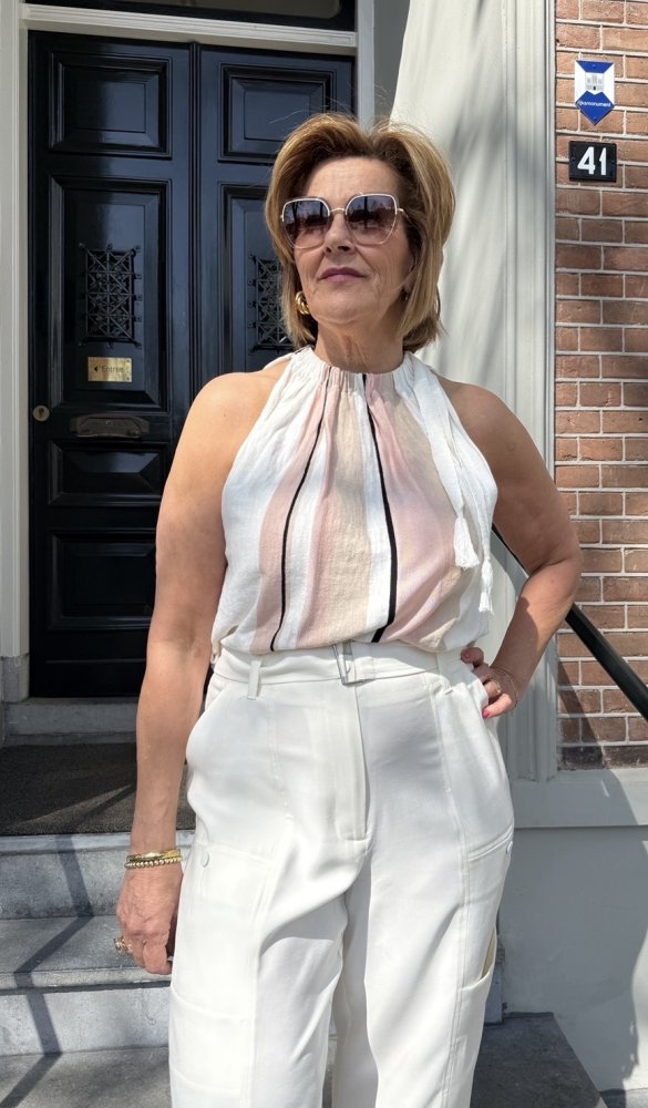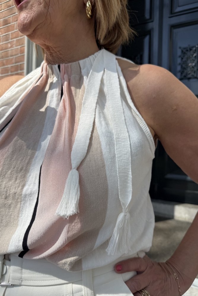 De subtiele streep in ton-sur-ton tinten met een lichte glans zorgt voor een rijke uitstraling, terwijl de halterhals met strikdetails een speelse en verfijnde touch geeft. Precies die combinatie die het bijzonder maakt, zonder overdreven te zijn.
