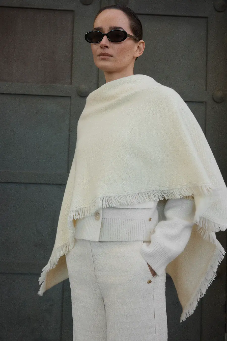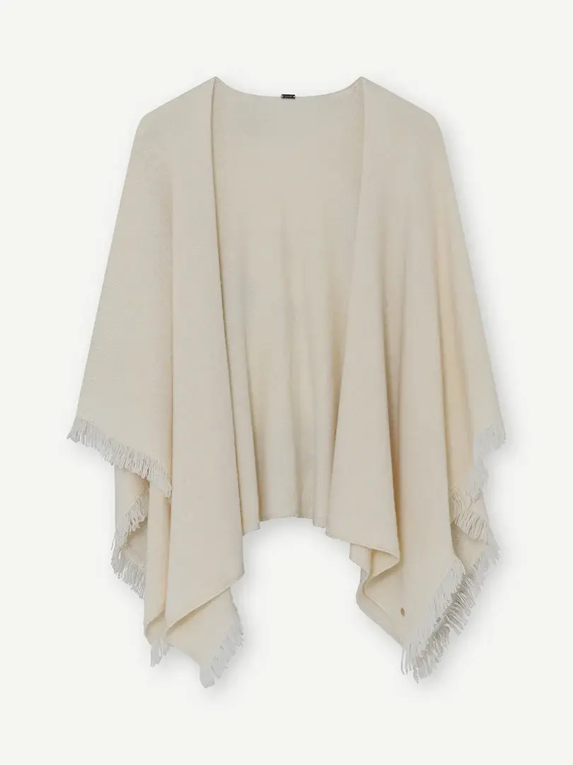 Esja van Gustav is een delicaat gebroken wit poncho van wol. Aan de onderkant is er een decoratieve franje. Perfect om over je schouders te dragen als het wat fris is.