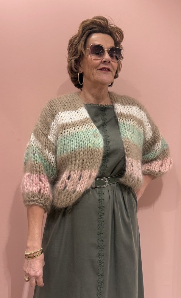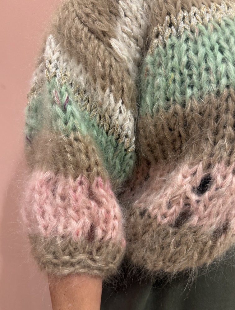 Handgebreid in een luxe mohairkwaliteit, vijf-draads gebreid voor een volle, rijke uitstraling.