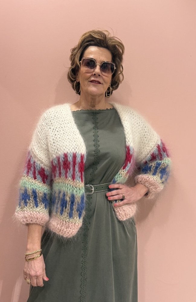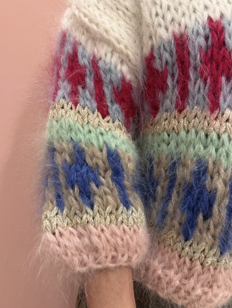 Handgebreid in een luxe mohairkwaliteit, vijf-draads gebreid voor een volle, rijke uitstraling.