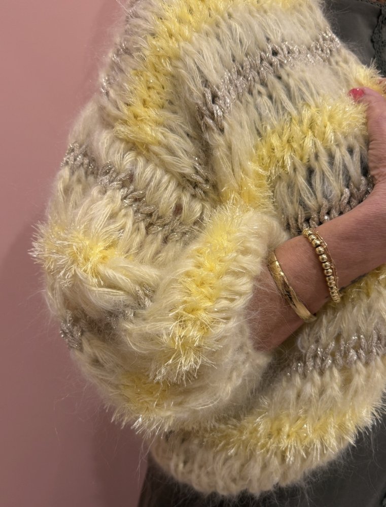 Handgebreid in een luxe mohairkwaliteit, vijf-draads gebreid voor een volle, rijke uitstraling.