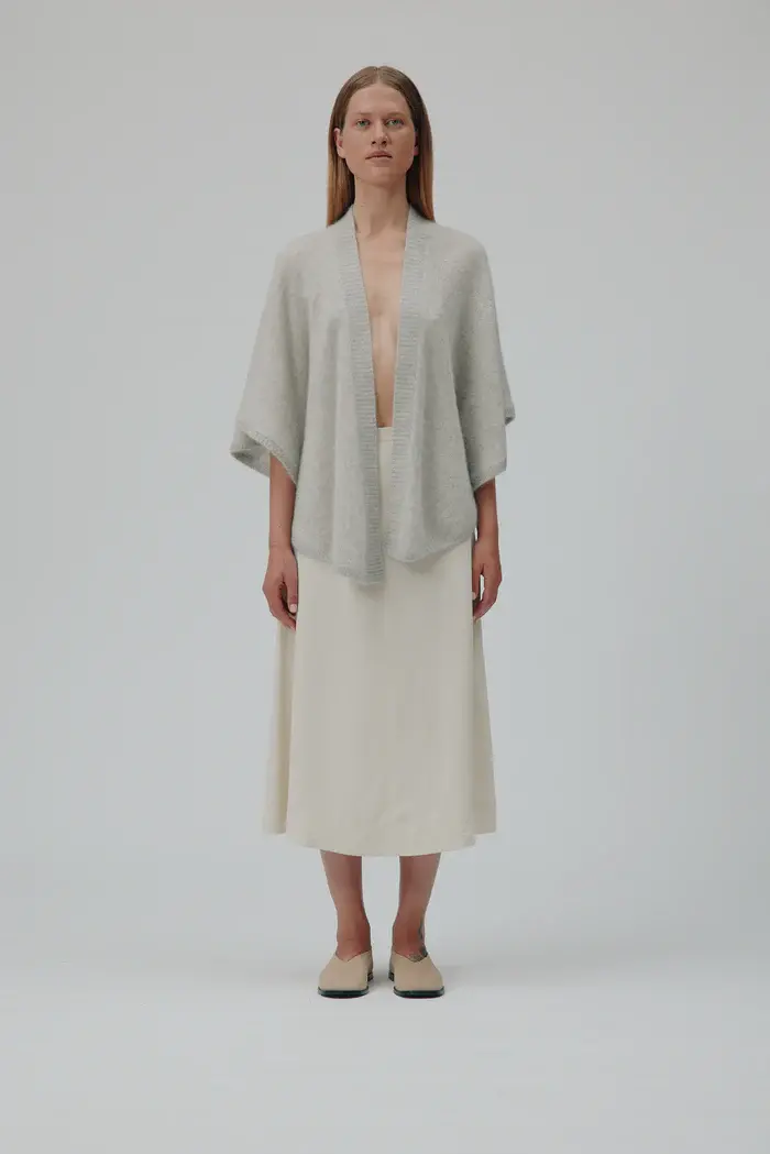Sanne is een omhullend vest van 100% ultrazacht Raccoon Wool, ontworpen als een cape voor een ontspannen en luxueuze pasvorm. Het heeft subtiele ribbels aan de voorkant en kleine geribde randen, wat een delicate textuur toevoegt aan de moderne, verfijnde silhouet. Perfect voor alledaagse elegantie of verheven gelegenheden.