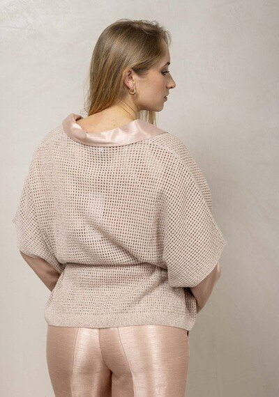 Zomerse, mouwloze gilet uitgevoerd in een luchtige ajoursteek met subtiele lurex-draad voor een prachtige, fonkelende uitstraling. De binder in de taille accentueert op elegante wijze je vrouwelijke silhouet. Een veelzijdig en stijlvol item voor zonnige dagen.