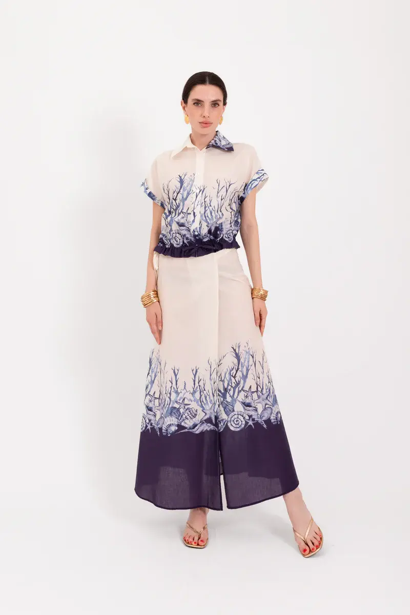 Blouse in burro met blauwe schelpenprint