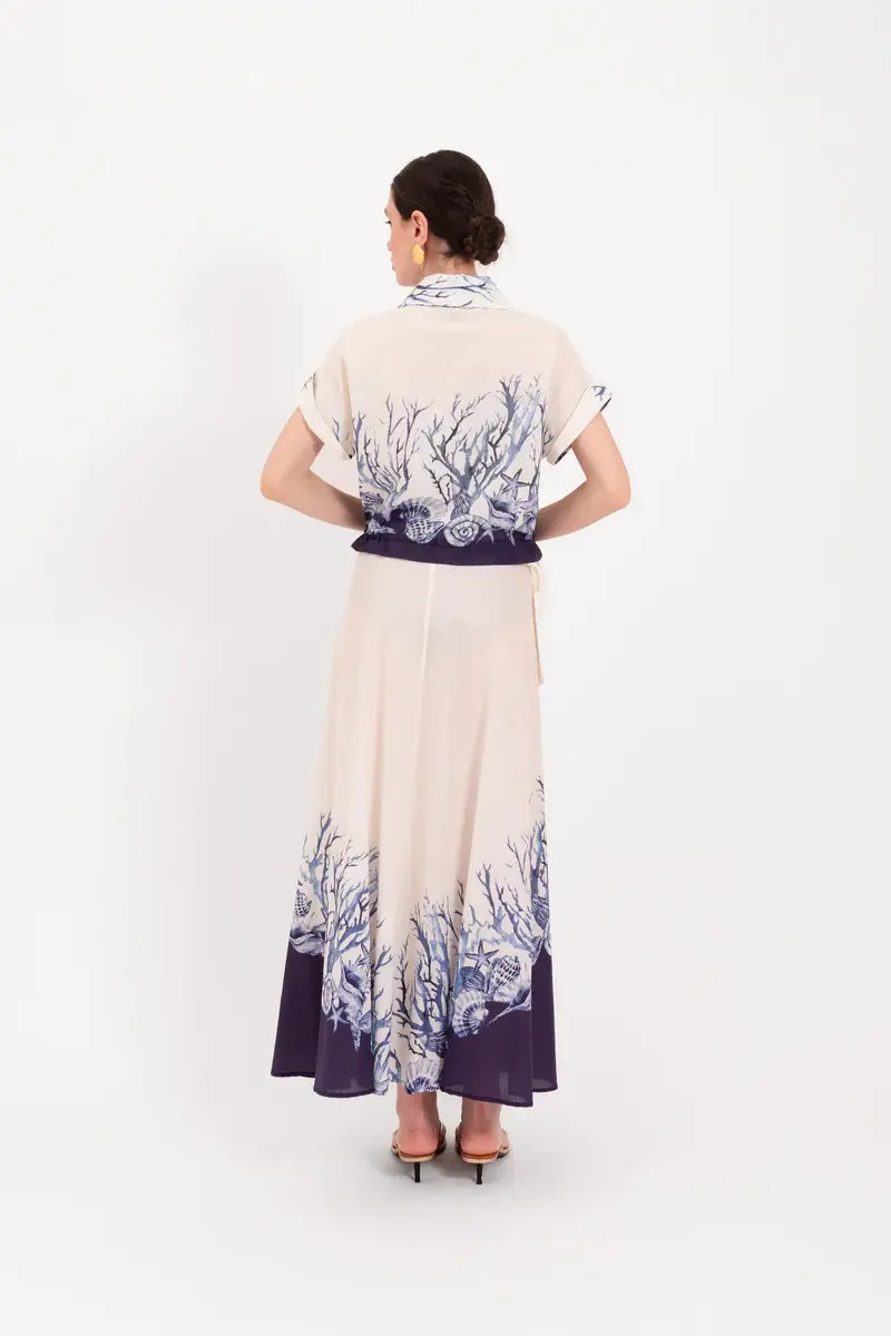 De zachte burro kleur vormt een rustige basis voor de blauwe schelpenprint, die subtiel maar opvallend aanwezig is. De korte mouwen en de soepele stof maken haar heerlijk draagbaar, terwijl de knoopsluiting aan de voorzijde zorgt voor een klassieke touch.